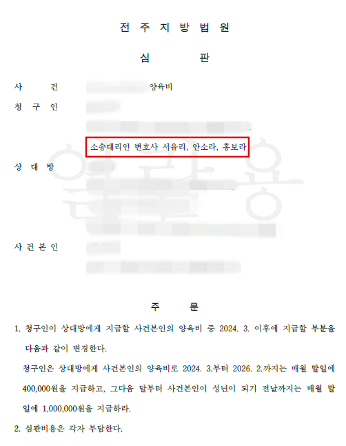 Hello, this is Attorney Yuri Seo. Today, I would like to introduce a case where we successfully obtained a court decision for child support modification (reduction and phased adjustment) in a situation where previously agreed-upon child support payments became impossible due to financial difficulties.