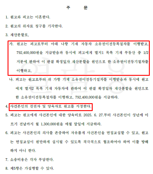 Secured Property Division of ₩792.4 million 💰 The court acknowledged the plaintiff's contribution and ruled that the defendant should pay a settlement of ₩792.4 million and transfer the ownership of the BMW vehicle driven by the plaintiff.